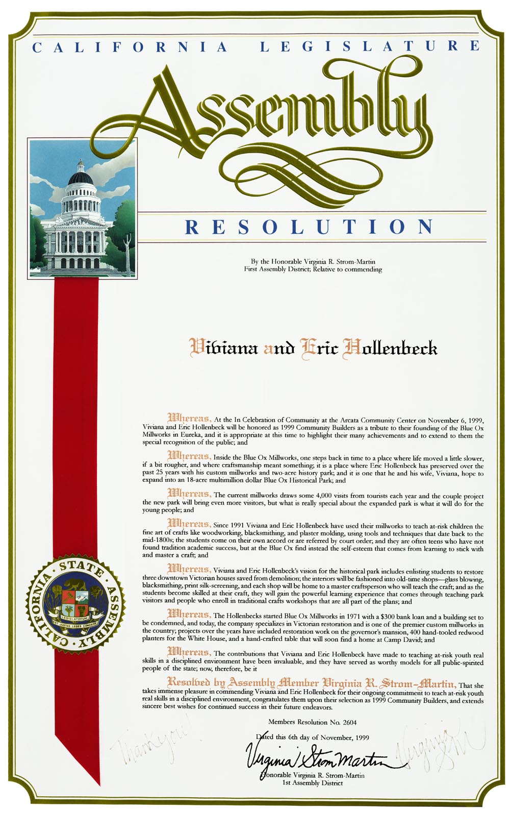 Blue Ox is the product of nearly four decades of work from master craftsman Eric Hollenbeck and his wife Viviana. It is a place where craftsmanship techniques of the last century are preserved and quality takes precedence over mass production. It's also a place where community comes together and lives are changed in positive ways. For this, and other reasons, Blue Ox was honored by a resolution before the California legislature.