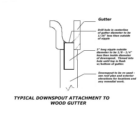 Another factor to consider is the downspout location. On the average, the house corners are the usual spot. On a very long gutter run, however, a downspout should be placed wherever they collect 1/3 of its volume of water. To facilitate the downspout connection, drill a hole 1/16" smaller than the downspout nipple. We use black iron nipples about 3" long and 1 3/8" in diameter. The nipple is then screwed into the hole in the gutter. Being 1/26" larger than the hole, it will make its own threads without damage to the gutter. This is the only water proofing required, as the threads inside will swell to seal. The nipple is then slipped inside a 1 1/2" downspout.